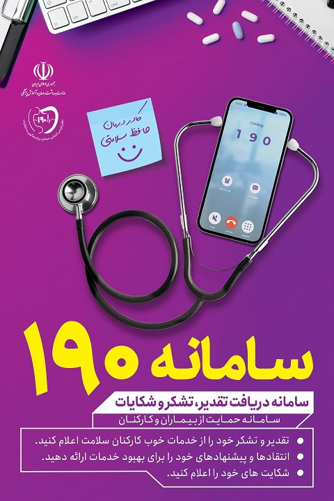 سامانه ملی رسیدگی به شکایات مردمی 190 مستقر در وزارت بهداشت، درمان و آموزش پزشکی ، جهت دریافت پیام های تقدیر و تشکر ، پیشنهادها و انتقادها و شکایات مرتبط با خدمات حوزه سلامت، به منظور بهبود نظارت و ارتقاء کمی و کیفی خدمات ، معرفی می گردد.